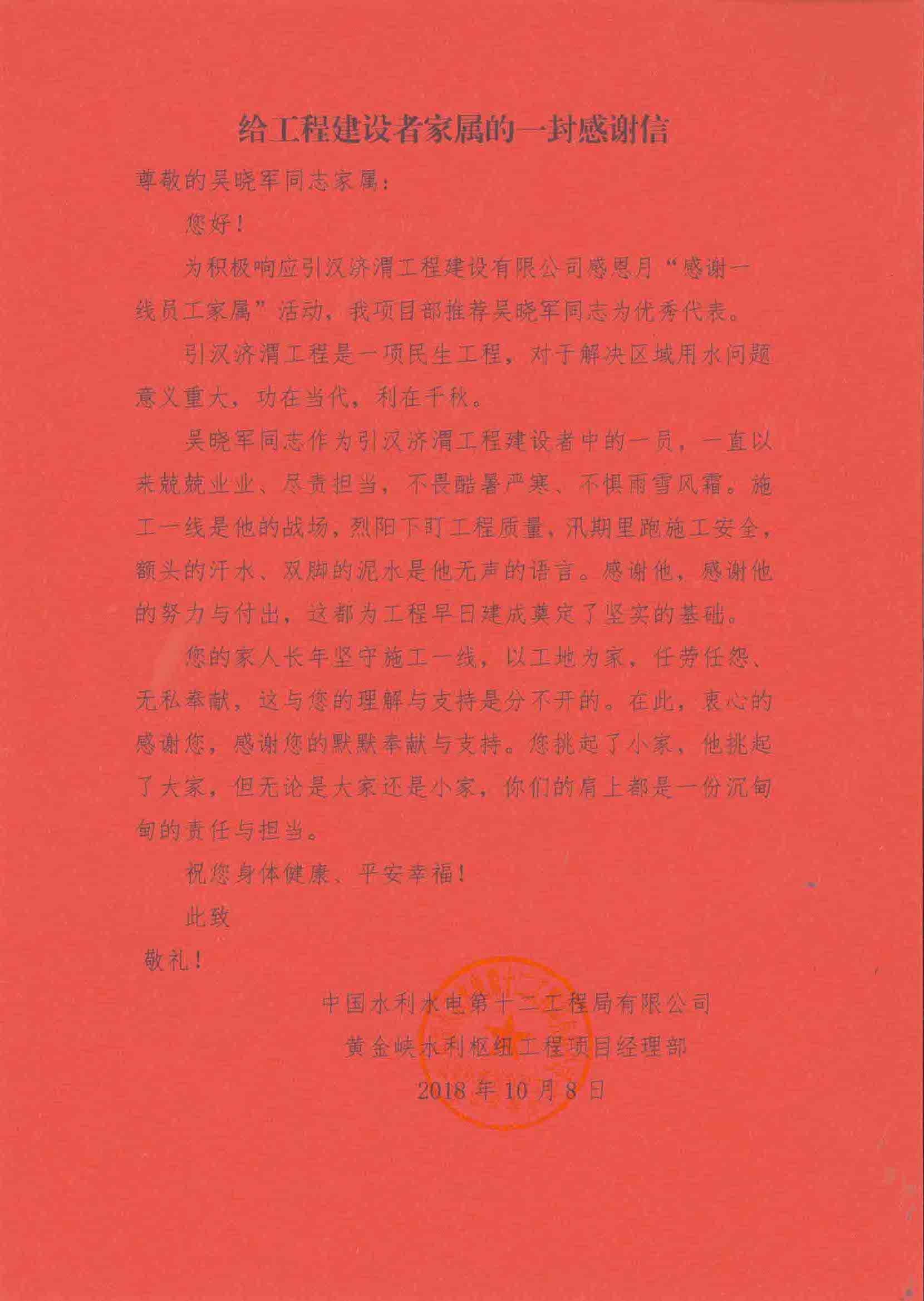 國慶期間為響應(yīng)引漢濟(jì)渭工程建設(shè)有限公司(業(yè)主)感恩月活動(dòng),黃金峽項(xiàng)目部積極組織開展感恩月“感謝一線員工家屬”主題活動(dòng)。 一線員工長年堅(jiān)守工程施工現(xiàn)場,難得與家人團(tuán)聚。他們?yōu)榱斯こ探ㄔO(shè)兢兢業(yè)業(yè)、執(zhí)著擔(dān)當(dāng),烈陽下盯工程質(zhì)量,汛期里跑施工安全,風(fēng)里雨里從不畏懼。額頭的汗水、雙腳的泥水是對他們最好的詮釋。同時(shí),他們還克服家庭離別、艱苦環(huán)境等各種困難,犧牲小我,為工程付出很多。這都與他們家人的理解與支持是分不開的。 感恩月期間,項(xiàng)目部推選施工現(xiàn)場優(yōu)秀員工代表,給他們的家屬寫感謝信,并購買精美小禮品進(jìn)行郵寄。感謝他(她)們的默默奉獻(xiàn)與支持,感謝工程建設(shè)者的努力與付出。希望他們能夠一如既往,為引漢濟(jì)渭工程的早日建成而努力奮斗。