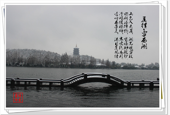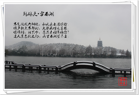 《五律·雪西湖》 一夜舞瓊花,今晨遍地它。 匆匆來采景,慢慢數(shù)詩家。 幽哦橋頭好,吟眸水畔佳, 風(fēng)亭稍作憩,誰可共鳴笳。