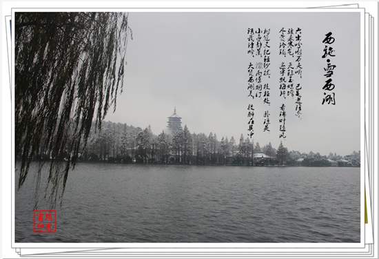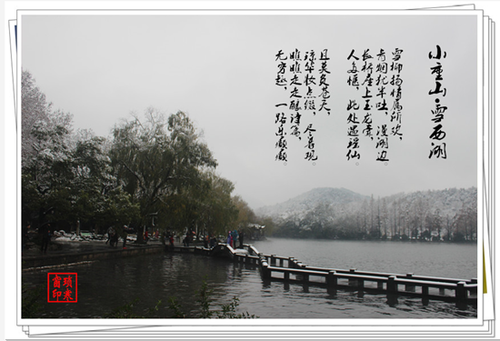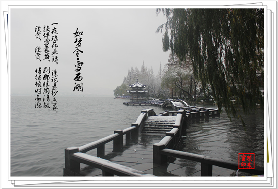《催雪·雪西湖》 天際烏云,湖畔郁霧,銀粟淺妝大地。 看畫里山川,曲橋追媲。 萬樹梨花點(diǎn)綴,滿眼是、者般銷魂麗。 雀兒鳴囀,閑人踽步,似無寒氣。 游憩,攬秀趣。 雪沫舞紛紛,老枝飛絮。 且聽笑、融和幾多歡語。 攝像頻頻掠景,怕辜負(fù)、今年瓊妃意。 留此景、待到殘冬,再敘臘梅花蒂。