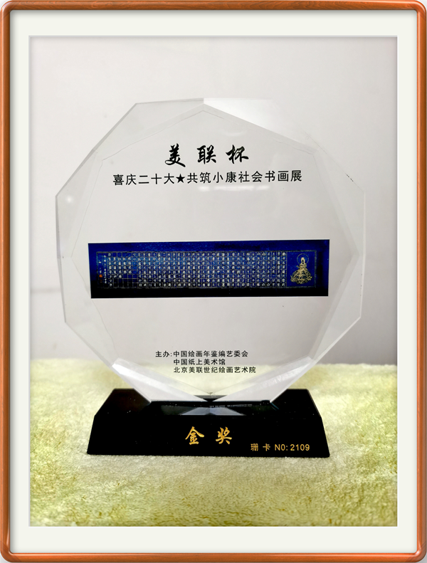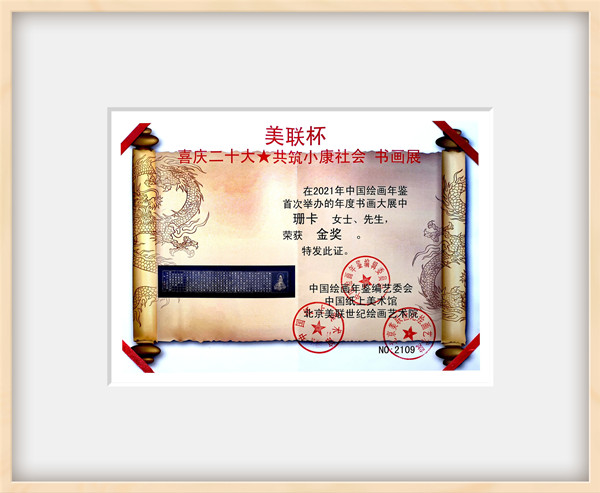 近日,公司退休職工珊卡獲得由中國(guó)繪畫(huà)年鑒編藝委會(huì)、中國(guó)紙上美術(shù)館、北京美聯(lián)世紀(jì)繪畫(huà)藝術(shù)院聯(lián)合主辦的”美聯(lián)杯”喜慶二十大 共筑小康社會(huì)書(shū)畫(huà)展金獎(jiǎng)。 珊卡老師,本名姚春榮,今年84歲,是中國(guó)水電十二局退休職工,青年時(shí)期就喜愛(ài)作曲與書(shū)畫(huà),工作之余及退休以后勤學(xué)苦練、苦心鉆研,其創(chuàng)作的作品多次獲得全國(guó)性大獎(jiǎng)。珊卡老師是中國(guó)音樂(lè)家協(xié)會(huì)會(huì)員,中國(guó)詩(shī)書(shū)畫(huà)研究會(huì)會(huì)員,中國(guó)明星書(shū)畫(huà)院(上海院)名譽(yù)院長(zhǎng),上海市閔行區(qū)書(shū)法家協(xié)會(huì)會(huì)員。珊卡老師的30余幅毛筆、硬筆作品曾多次在國(guó)內(nèi)外大賽中獲獎(jiǎng),其作品分別于2014、2015、2016年入編《中國(guó)繪畫(huà)年鑒》,并赴美、日、韓展覽收藏。