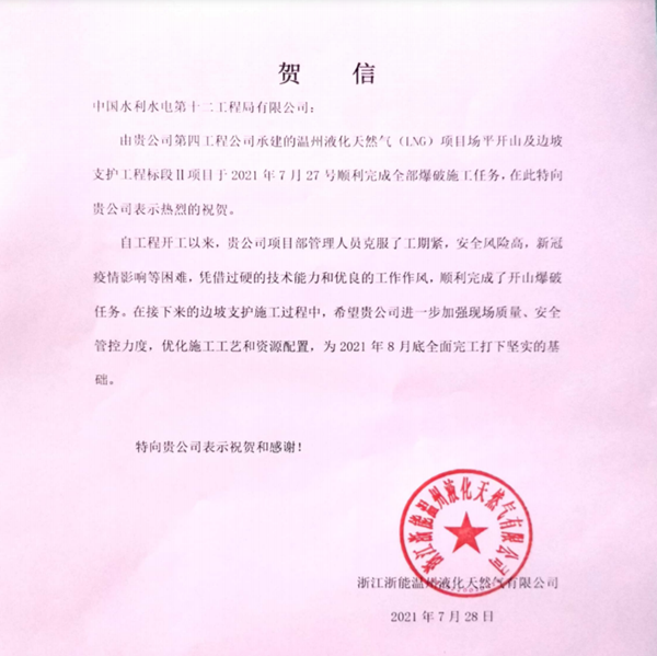 7月28日, 溫州液化天然氣(LNG)項(xiàng)目場平開山及邊坡支護(hù)工程標(biāo)段Ⅱ工程最后一次爆破工作圓滿結(jié)束,業(yè)主單位浙江浙能溫州液化天然氣有限公司發(fā)來賀信,贊揚(yáng)溫州液化天然氣LNG標(biāo)段Ⅱ施工項(xiàng)目部在爆破工作方面的成績。 收到賀信,項(xiàng)目部上下備受鼓舞,項(xiàng)目部全體人員表示,在以后的施工過程中,再接再厲、乘勝前進(jìn)、奮力拼搏、扎實(shí)工作,為實(shí)現(xiàn)8月底全面完工做出更大的貢獻(xiàn),給公司和業(yè)主交上一份滿意的答卷。